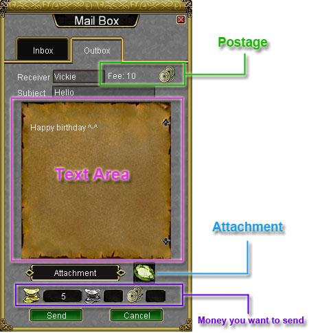 If you need to send item, just open your Item Box and drag the item to Attachment blank. Very easy! To send money, just input the amount beside the corresponding icon.
